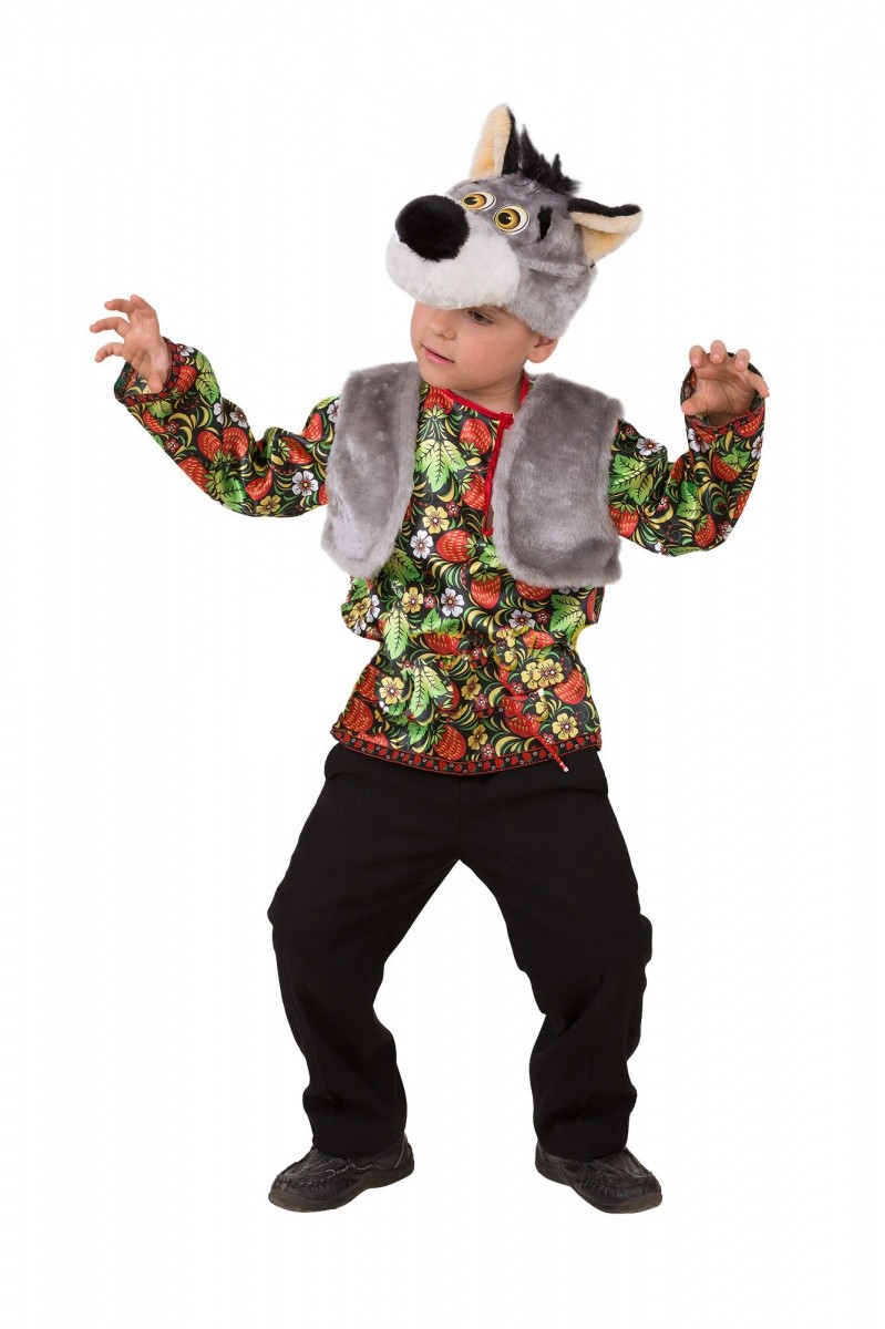 Детский костюм Волка Еремы выполнен из атласного материала и искусственного меха. В комплект костюма входит черная рубашка с принтом под хохлому, серый меховой жилет, а также шапочка-маска, выполненная в виде мордочки волка с черным носом и светлыми ушками.