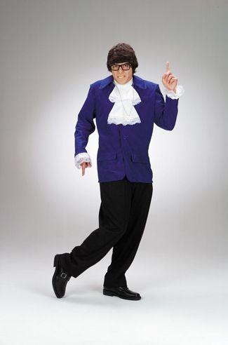 Стандартный костюм Остина Пауэрса включает в себя фиолетовый пиджак, манишку с жабо и очки. Штаны в комплект не входят. Такой костюм прекрасно подойдёт для выступлений, карнавалов и маскарадов.