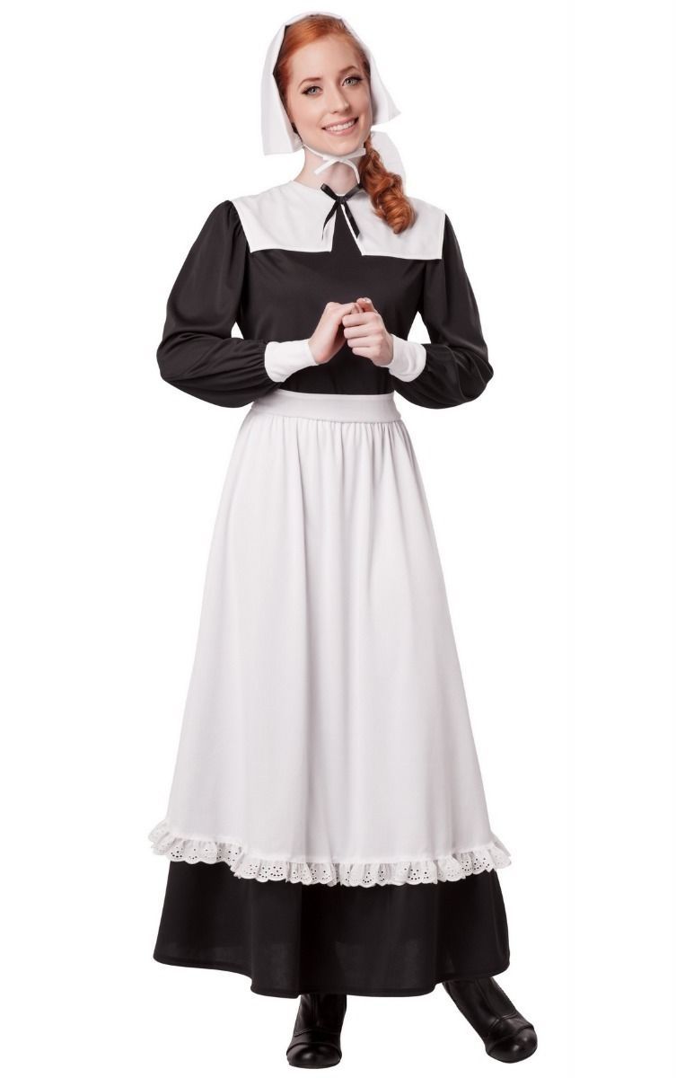 Женский костюм Пилигрима идеален для проведения Дня Благодарения. Костюм включает в себя длинное черное платье с длинным белым фартуком и воротничком, а также белую шапочку-чепчик на завязочках.