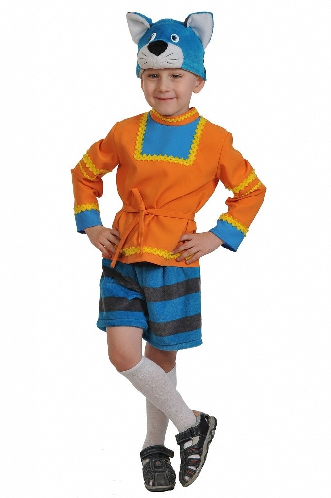 Костюм кота Тимофея - яркий детский костюм, который подойдет для маскарадных праздников и постановок спектаклей. В комплект входит оранжевая яркая рубаха с голубыми манжетами и голубой вставкой на воротнике, полосатые серо-голубые шорты и шапочка-маска голубого цвета в виде мордочки кота.
